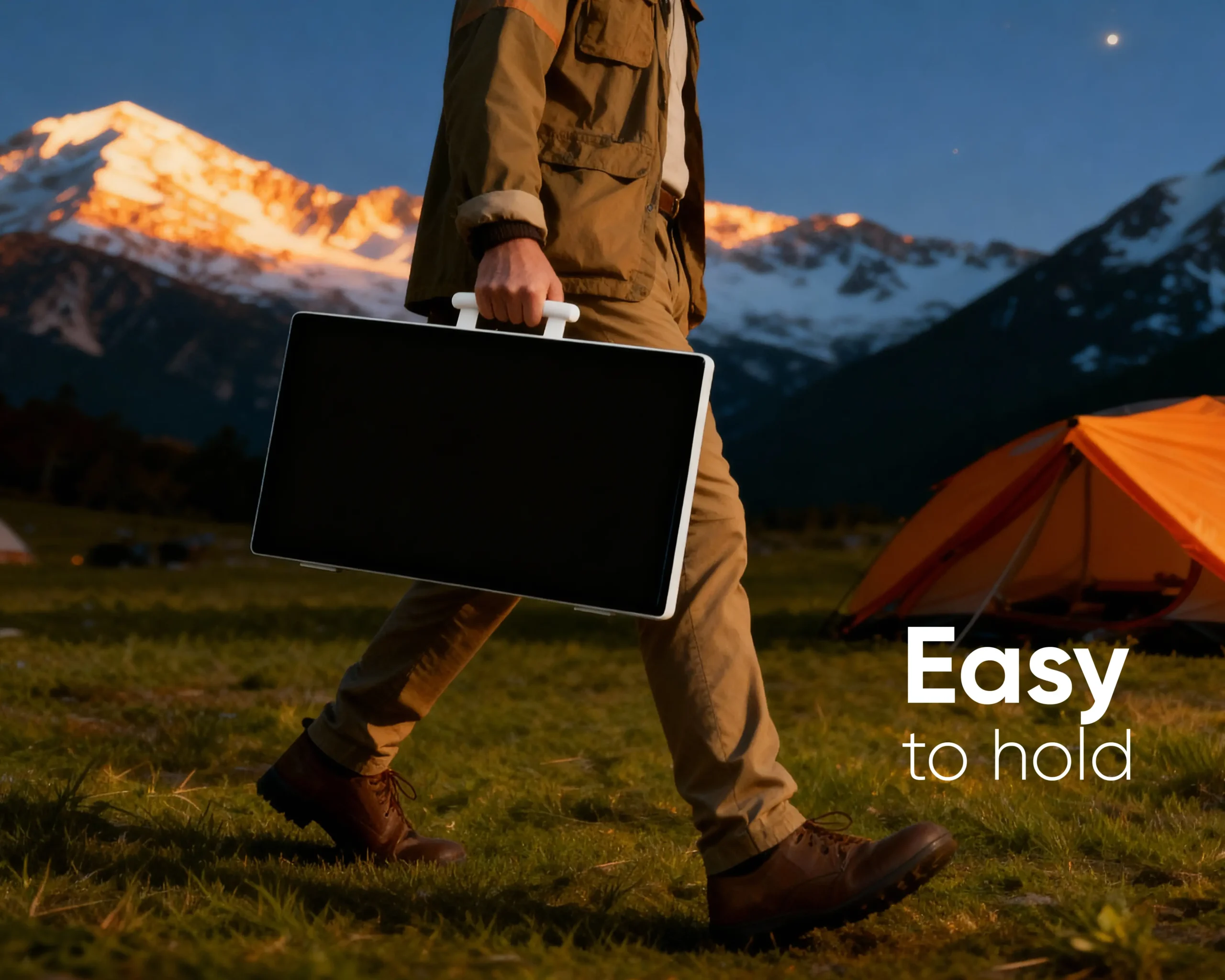 Tough enough for weekend adventures — built for UAE winter camping. From desert nights around the bonfire to breezy mountain getaways, it packs light, sets up fast at camp, and keeps everyone entertained with a big, touch-friendly screen you can carry by the handle and prop with the kickstand