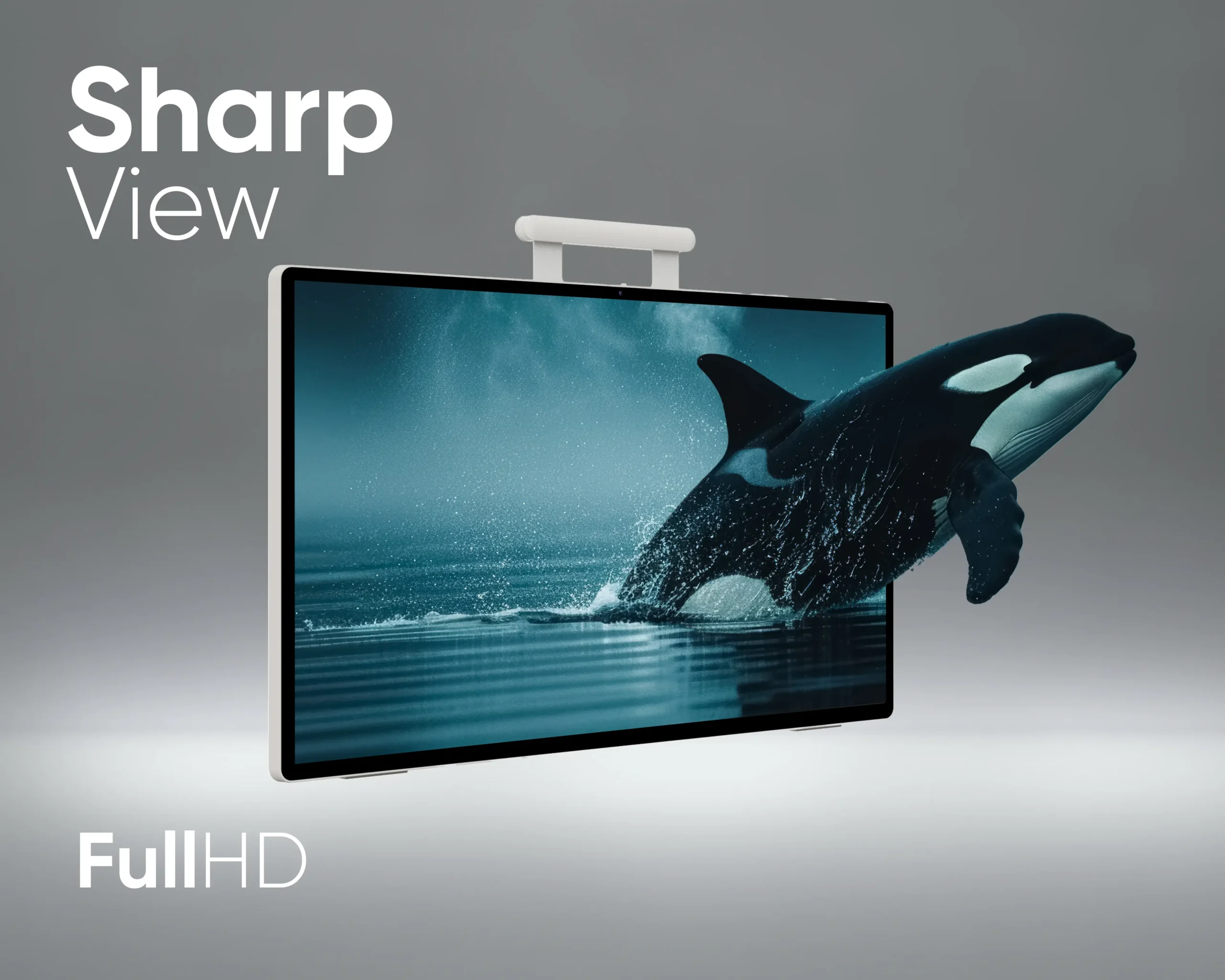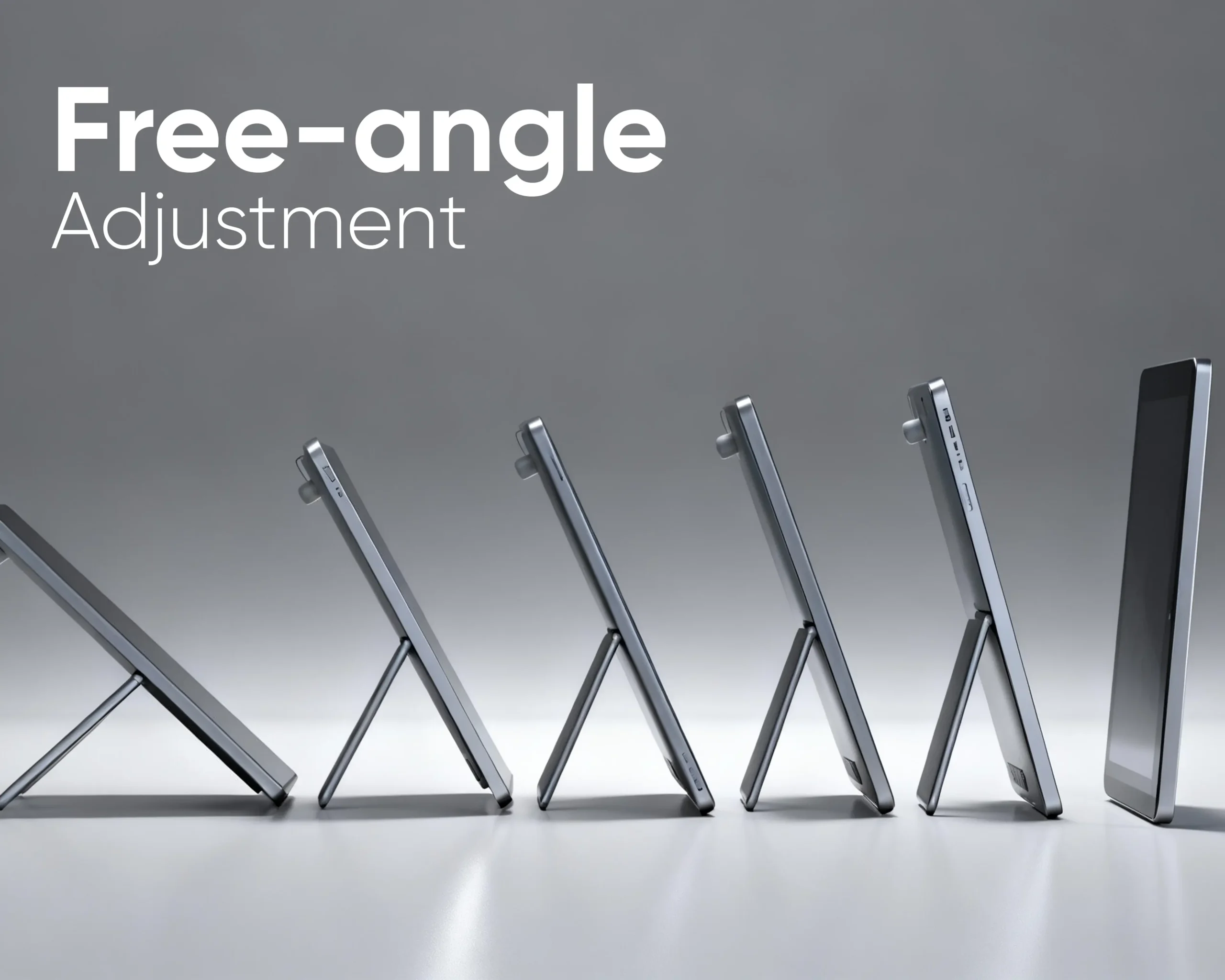 Take it anywhere: a 0°–90° kickstand switches from tabletop to easel, portrait or landscape, with an ergonomic carry handle and a thin, fabric-covered back on an aluminum body for a soft-touch, premium feel. At your desk or van-life rig, the unit is VESA-mount ready for arms and stands.